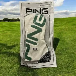Set of PING golf club headcovers. Features bold green logo on white background. Perfect for protecting your clubs.