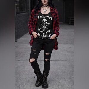 This black Cartel Ink graphic tank features the iconic “I Refuse To Sink” skull + anchor design that gives full biker/goth energy with zero effort.