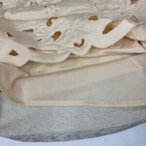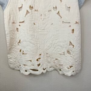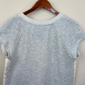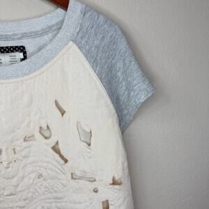 Stylish long sleeve tee with intricate cut-out design. Soft cream body with gray sleeves. Perfect for casual wear.