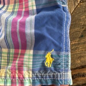 These Polo by Ralph Lauren shorts showcase a vibrant plaid pattern in blue and pink, perfect for a casual summer day. Crafted with a lightweight material, they offer comfort and style with an elastic waistband and drawstring closure. Ideal for a relaxed outing, these shorts embody a classic preppy look.