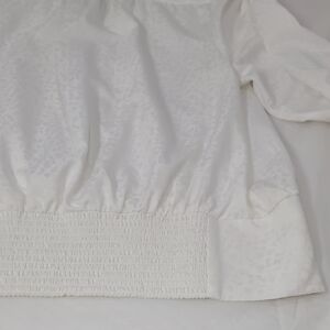 This elegant Karl Lagerfeld blouse showcases a chic mandarin collar and delicate ruffled accents, perfect for adding a touch of sophistication to any outfit. Crafted in a pristine white hue, its long sleeves and buttoned front make it a versatile choice for both formal and semi-formal occasions.Never worn.