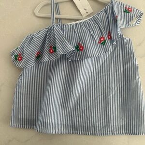 This stylish blouse from Janie and Jack features a charming blue and red color palette with a ruffled asymmetrical neckline. The lightweight fabric and sleeveless design make it perfect for warm weather, while the red floral embroidery adds a sweet touch to the classic pinstripe pattern.