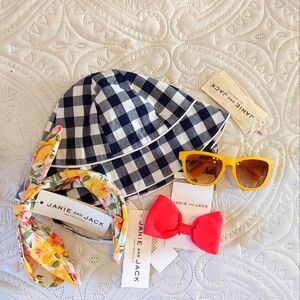 All NWT Janie and Jack bundle. Navy and white Checkered hat 6-12 months , yellow sunglasses, red hair bow, yellow floral headband. So cute