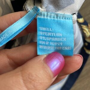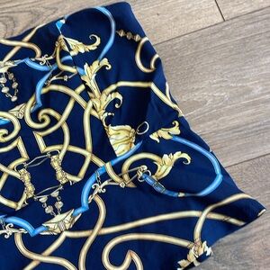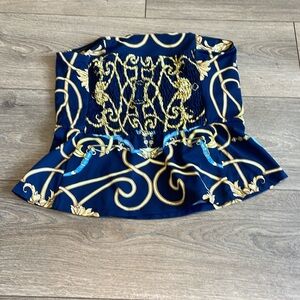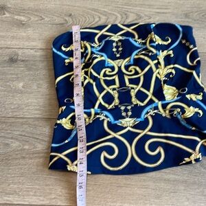 This elegant strapless top features a striking baroque print in navy blue and gold. Perfect for a night out or a stylish day look.
