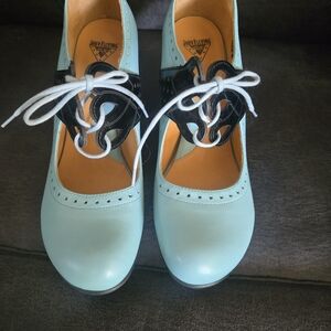 John Fluevog Bellevue Mollie Johnson Lace Up Aqua and Black Heels