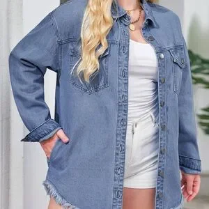 Stylish denim button-up shirt featuring a frayed hem. Perfect for casual wear.