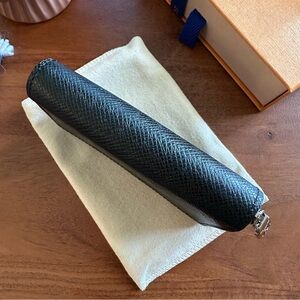Authentic Louis Vuitton Zippy Coin Purse Vertical in sleek black Taiga leather, model M30511. A compact, high-quality wallet for cards, coins, and folded bills—perfect for minimalists or anyone on the go.