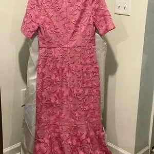 This stunning pink sheath dress by JS Collections is perfect for wedding guests and cocktail events. It features a flattering V-neckline, with a fitted silhouette that gracefully falls to a midi length. The dress's romantic lace texture adds a touch of sophistication to any special occasion.