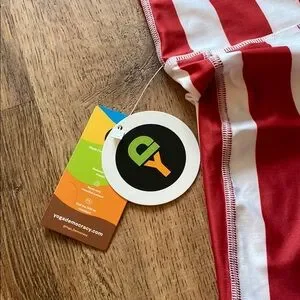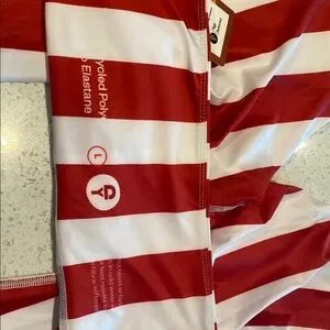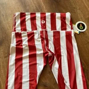 These new with tags striking red and white striped pants from Democracy feature a bold vertical pattern and a dramatic bell-bottom silhouette. With a high waist and wide flare starting at the knee, they offer a retro-inspired look perfect for casual outings. The sturdy fabric ensures the pants maintain their structured shape, making them a standout piece in any wardrobe.