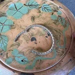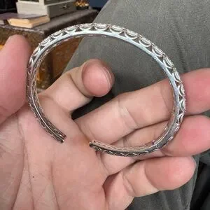 This used Tacori bracelet showcases a sophisticated silver design with an intricate woven pattern, offering a polished and lustrous finish. The medium width and elegant craftsmanship make it a standout piece suitable for everyday wear. Size 7