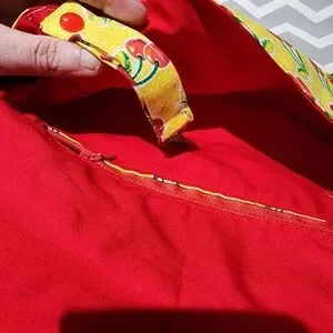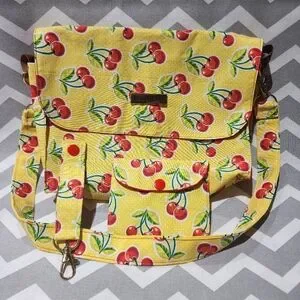 Brighten up your look with this handmade crossbody bag, featuring a cheerful cherry print in vibrant yellow and red. This playful accessory is perfect for adding a splash of color to your casual outings. This handbag set is handmade with 100% cotton cherry print fabric. It is 9" wide by 8" deep with a 22" strap. It has a magnetic snap closure and an inside zipper pocket. It comes with a matching mini card wallet and a matching keyfob that attaches by snap to the inside of the bag so you don't lose your keys. Cross posted.