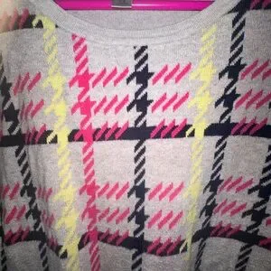 Stay cozy and stylish with this plaid patterned gray sweater. Perfect for any casual outing.