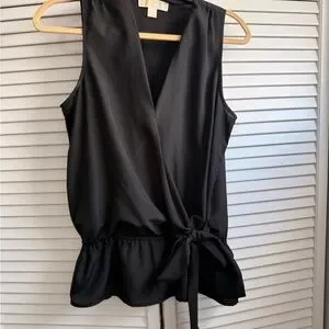 This chic black blouse by Michael Kors features a stylish wrap design with a tie front that accentuates the waist. The peplum detail adds a touch of elegance, making it suitable for both professional and casual occasions. Its silky texture enhances its sophisticated appeal.