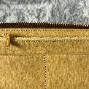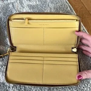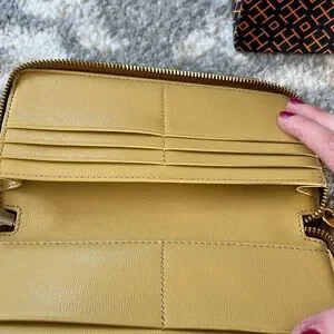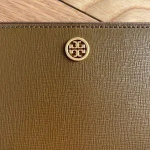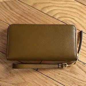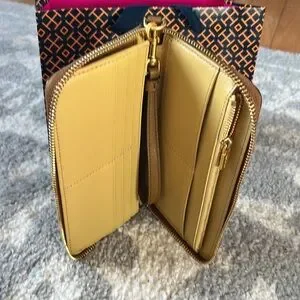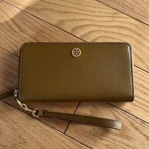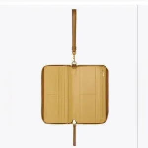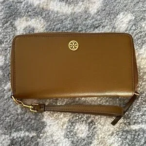New! Tory Burch Robinson crosshatch tan leather wristlet / wallet. Wrap around zip and multiple card holders and zip coin pocket. Can fit smaller sized I phone. Gold logo hardware. Tags removed but never used. $198