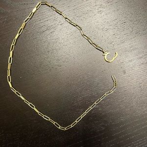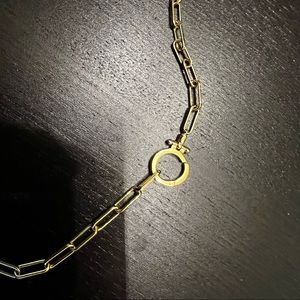 Elegant gold link necklace. Features a circular clasp. Perfect for layering or standalone wear.