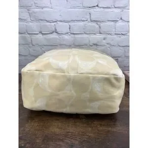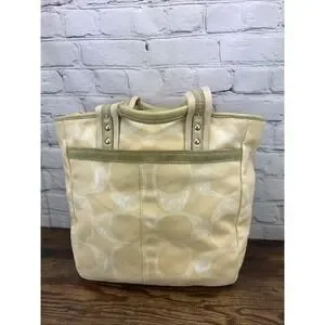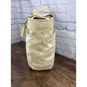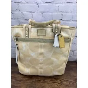 Keywords: Coach, tote bag, handbag, purse, satchel, signature print, designer bag, tan, beige, gold hardware, canvas tote, shoulder bag, luxury handbag