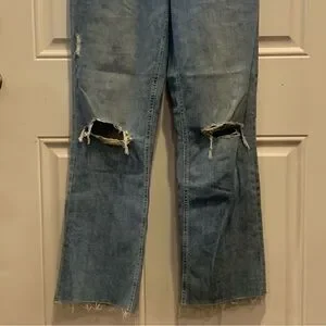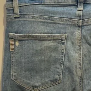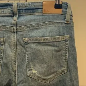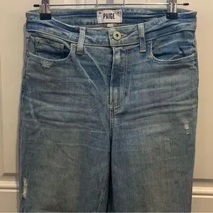 Experience the perfect blend of style and comfort with PAIGE's blue ankle cropped jeans, featuring intentional knee distressing for a trendy touch. The light-to-medium wash and vintage-style fading create a relaxed, lived-in look ideal for casual outings.