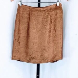 & other stories Draped Metallic Satin Mini Skirt in Bronze. This beautiful metallic satin mini skirt from & other stories are designed with an elegantly draped and gathered front. Features include fully lined interior and side zip entry.