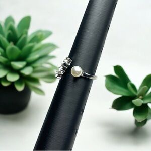 This elegant women's ring features an open top with stunning silver band adorned with a beautiful faux pearl and cubic zirconia sparkling crystals. Perfect for adding a touch of sophistication to any outfit. Adjustable.