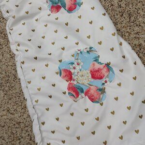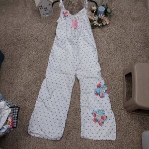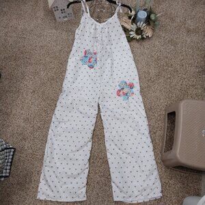 3505 Size Large Tie Shoulder Jumpsuit In White with Gold Hearts And appliqued flowers. Pit to pit 20" length from the shoulder 56". Loose fitting with pockets.