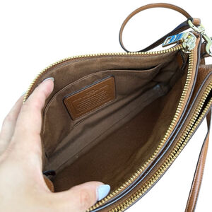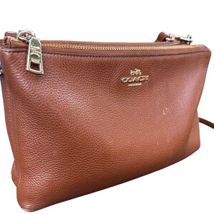 Coach crossbody bag, brown pebbled leather with gold-tone hardware. It features two zippered compartments and a detachable, adjustable shoulder strap. The bag shows some signs of wear, including minor scuffs and marks on the leather surface, but is overall in good shape. The interior is lined with a brown fabric and contains a slip pocket. The Coach logo is embossed on the front of the bag.