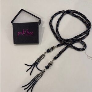 This Park Lane necklace features a striking black braided cord, adorned with small metal elements that add a touch of elegance to its bohemian style. The long, versatile design allows it to be worn as a statement piece or wrapped multiple times for a layered look. Perfect for adding a unique flair to any ensemble.