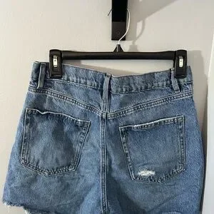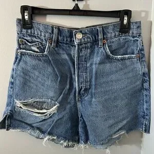Trendy blue jean shorts with a distressed look. Features frayed hems and a casual style. #jeanshort #garage #women