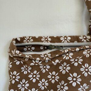 Acacia, OS, Brown/White Flower Print, Sturdy condition/material (some signs of use) one rip at base, and handle. but zipper and inside good cond