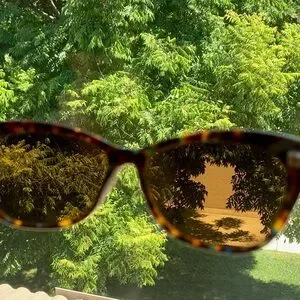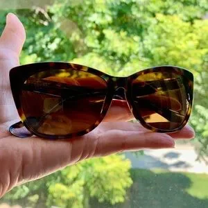 Elegant cat-eye sunglasses with a blue tortoiseshell frame. Features stylish brown lenses. With case.