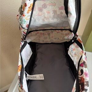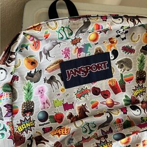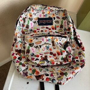 This JanSport backpack showcases a whimsical food/animal/fun-themed print on a white cream base, making it a standout accessory. Known for its durability and style, this bag is perfect for adding a playful touch to your everyday look. NWOT. Never used.