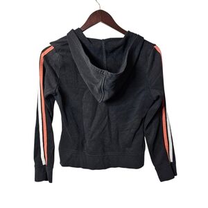 This black full-zip hoodie features bold "HARLEY-DAVIDSON Motorcycles" text across the chest in red and white lettering, embodying the brand's iconic spirit. The sleeves are accented with sporty orange and white stripes, adding a dynamic touch. It includes a drawstring hood and two front pockets for practicality. Made from a comfortable blend, this hoodie is ideal for cooler rides, casual outings, or simply showing off your love for the legendary brand.