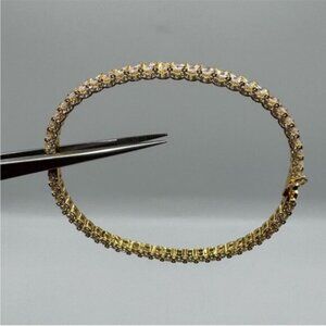 This beautifully crafted bangle is set with 12ct.tw of dazzling round brilliant cut white zircons secured in a shared prong setting that catch all light; each side of the bracelet has fine detailed gems in a swag motif