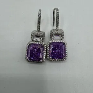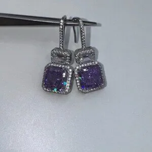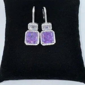 Each earring is accent with a 4ct purple stone preceded by a 1.04tcw radiant cut white zircon, cut to brilliance in the same technique as real diamonds