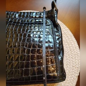 This is a vintage Brighton black crocodile leather shoulder bag in very good used condition. This bag is super versatile - the front zip pocket is very roomy and easy to access and opens up to credit card slots. The interior is very clean and has two open pockets and a zip pocket. It is the perfect size at approximately 10" x 10" and the strap drop is approximately 10".
