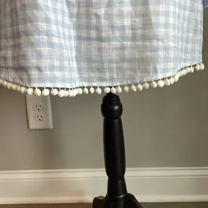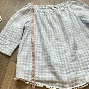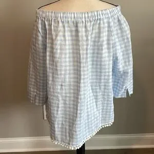 Chic off-shoulder top in a stylish blue and white checkered pattern. Perfect for casual outings. Ball tassels on bottom hem, 3/4 sleeve. Gingham print.