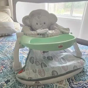 Charming monkey-themed baby seat by Fisher-Price. Features a soft gray monkey design and a light green tray. Includes a playful leaf pattern.