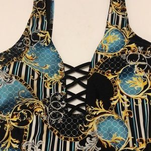 Coral Tropics by Apollo Swimwear One piece swimsuit In a black aqua yellow print Has U back Sexy criss cross openings on sides and at chest Material is 82% nylon and 18% spandex Plus Size 1X Great condition! Fast same day/next day shipping!