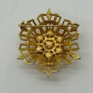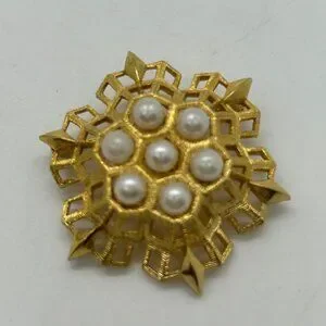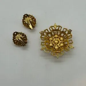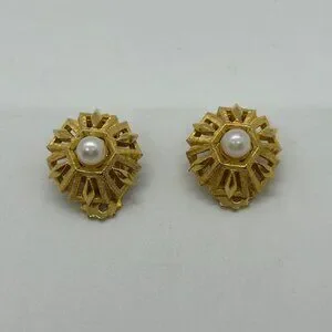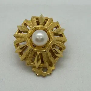 This elegant vintage jewelry set features a gold-tone brooch and matching clip-on earrings, accented with faux pearls for a timeless look.