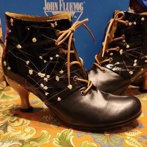 JOHN FLUEVOG Bellevue Rose Dunn Black & Gold Pressed Flowers Lace Up Ankle Boots