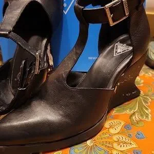 "Spectacular t-strap wedge heels that feature sexy open sides and a marbled rubber wedge heel, they’ll have you humbly shoving away an onslaught of compliments in no time." -Sole Message: "Iron Out Your Ishshoes"