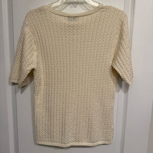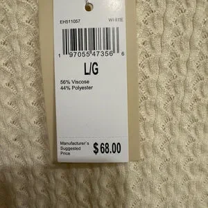The item is an Ellie Mae top, size Large, in new condition with original tags. The top is white and features short sleeves and a round neckline. It is made of 56% Viscose and 44% Polyester. The fabric has a textured, woven appearance. The original price tag indicates a manufacturer's suggested retail price of $68.00. No visible imperfections are noted.