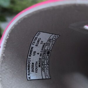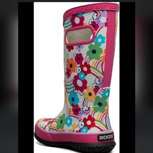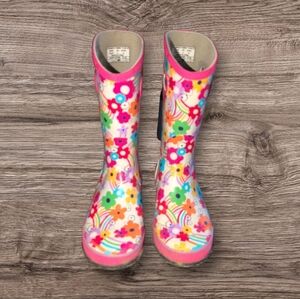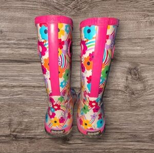 Vibrant rain boots with a floral pattern. Features pink, orange, yellow, green, blue, and purple flowers. Perfect for rainy days.