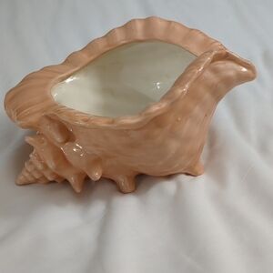This exquisite ceramic piece captures the essence of marine beauty with its peach and white hues. The rippled, wavy edges and sculpted ridges mimic the natural texture of a seashell, creating a flowing, organic quality. Perfect for adding a touch of elegance to any art collection or home decor add your favorite plant at highest point measurements are 9" x 4.5"