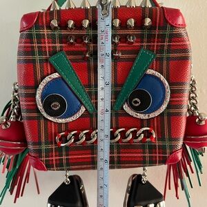 These mini bags feature a vibrant red and green plaid pattern, accented with whimsical monster-like details. The structured design is enhanced creating a fun and quirky look. Silver chain hardware adds a touch of metallic flair, making these bags a standout accessory for any occasion.