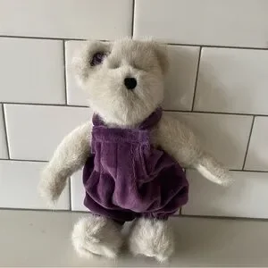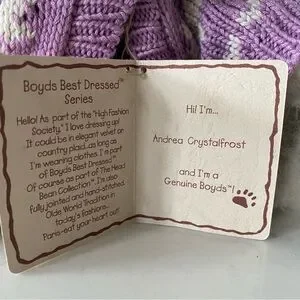 Adorable plush bear wearing cute purple overalls with an adorable purple sweater with a white sparsely glitter fur collar and snowflake knitted design. Cloths are removable if you wanted to display without winter clothes. The best thing about Boyd’s Bears is they are jointed so her arms legs and head can rotate. The attention to detail is exquisite right down to the little snowflake embossed button. Perfect for collectors or as a gift. Retired.
