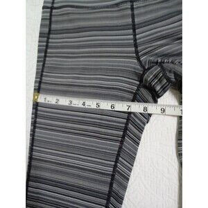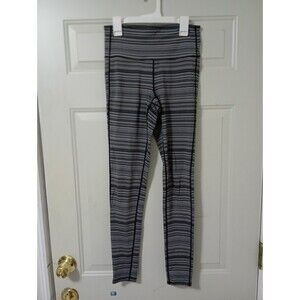 The Athleta Expanse Chaturanga Leggings in size small are high-rise yoga leggings featuring a versatile multicolor striped pattern in black, white, and gray.