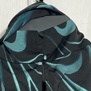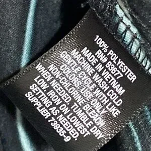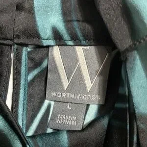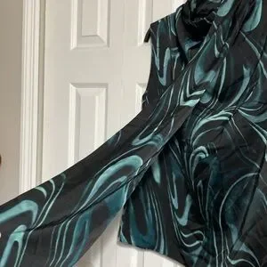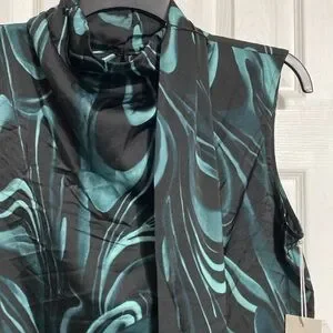 Polyester lightweight satiny top front slouch neck with attached scarf detail. There is two button high neck key hole back at neck. Attached scarf on shoulder and loop on other side. Approximate Measurements Laying flat: pit to pit 22” - shoulder to hem 25” - sleeveless. Preowned good with tag and extra button condition please check all pictures.
