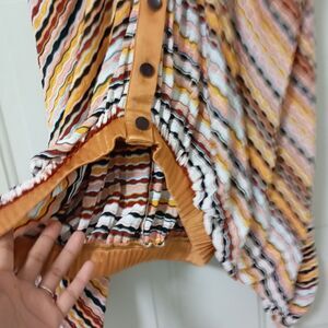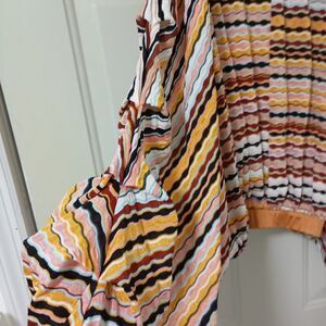 With bare shoulders and balloon sleeves, this pullover blouse features a multicolored pattern and button accents. Made from polyester and elastane, this breathable garment is machine washable for easy care.
