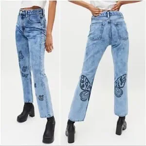🍒[ X-Girl ] Butterfly Print Acid Wash Straight Leg Jeans