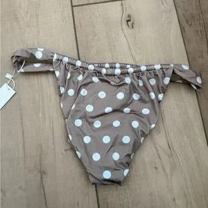 Chic bikini bottom with white polka dots on a tan fabric. Ideal for stylish beachwear.